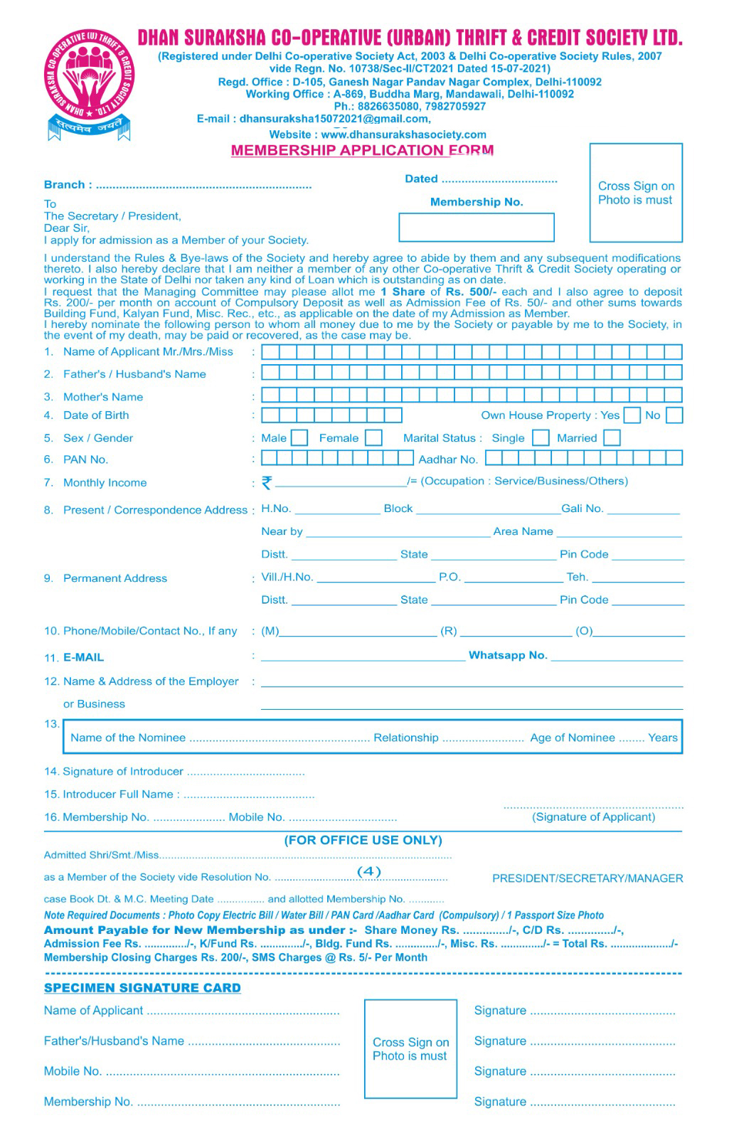 Share Money and Compulsory Deposit (CD) shall be min. Rs. 5000/- each deposited into the account of the member.